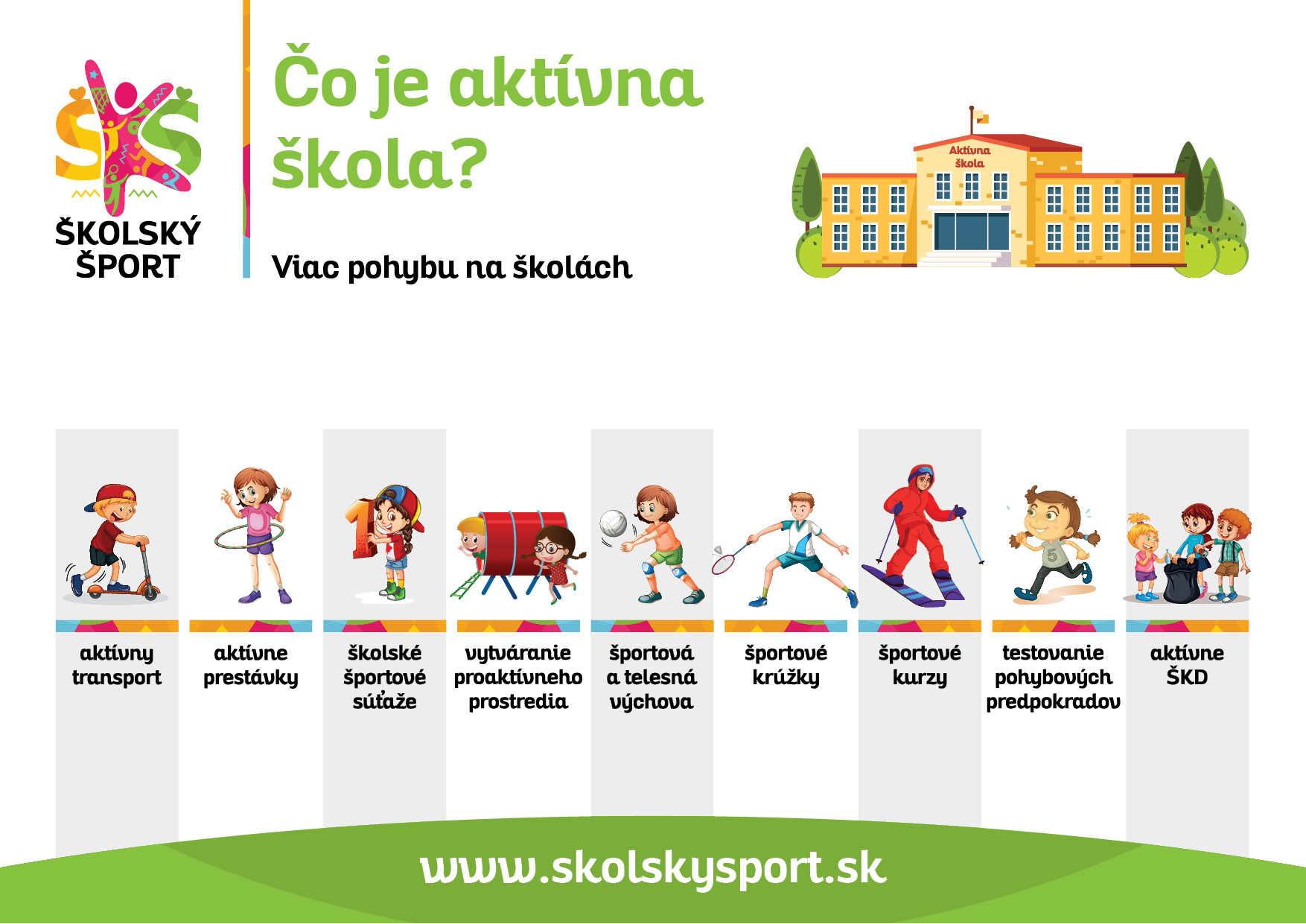 V rámci projektu Školský šport podporuje MŠVVaŠ SR projekty zamerané na zvyšovanie mobility žiakov a podporu aktívnej dochádzky do a zo školy. Aktívna škola začína cestou do školy pešo, na bicykli, kolobežke alebo korčuliach. Aktívnym transportom vieme deťom zabezpečiť až ¼ minimálnej odporúčanej denne pohybovej dávky podľa WHO.